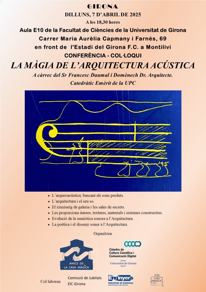 Dilluns vinent, 7 d’abril, a 2/4 de 7 de la tarda, a l’aula E10 de la Facultat de Ciències de la UdG, el Dr. Arquitecte Francesc Daumal i Domènech, Catedràtic Emèrit de la UPC, oferirà la xerrada “La màgia de l’arquitectura acústica”, que ja va fer fa pocs dies a Santa Cristina d’Aro amb gran èxit d’assitència.