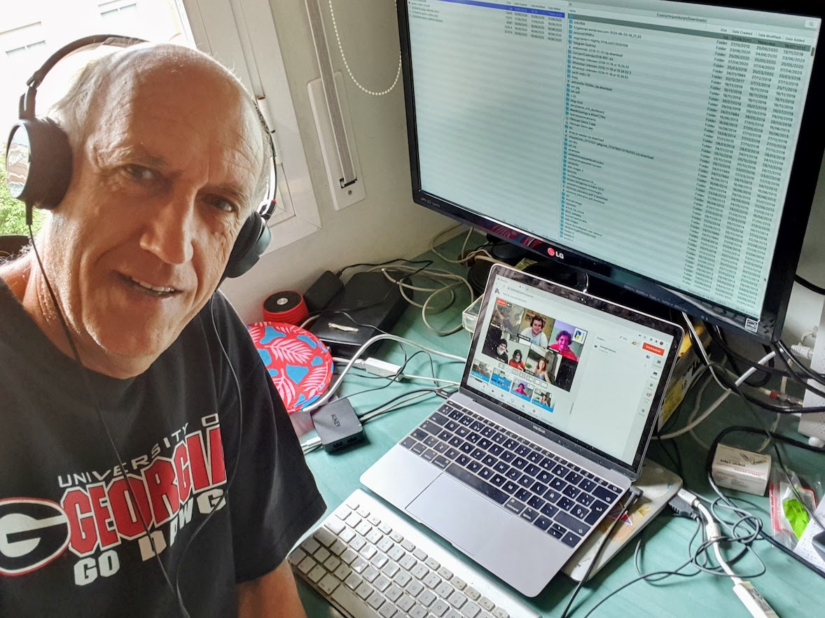 Les trobades de les 10 les fem amb Google Meet. De moment, com que són informals, no les gravem ni fem en streaming (no es l’objectiu), però ho podríem fer donat que la UdG té Google Apps for Education. Les sessions en streaming de les 12 les fem amb StreamYard: aquí se’m pot veure davant de la consola de l’StreamYard.